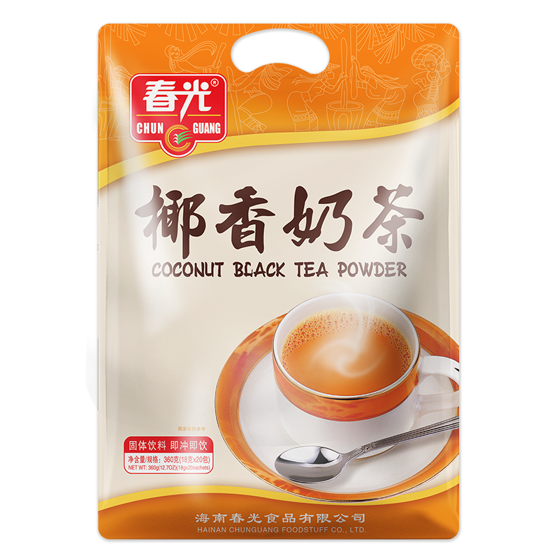 植脂末【植物油、玉米糖漿、食品添加劑(酪蛋白酸鈉、單,雙甘油脂肪酸酯、硬脂酰乳酸鈉、磷酸氫二鉀、檸檬酸鈉、二氧化硅)】、白砂糖、全脂乳粉、椰子粉、干酪粉、紅茶粉。