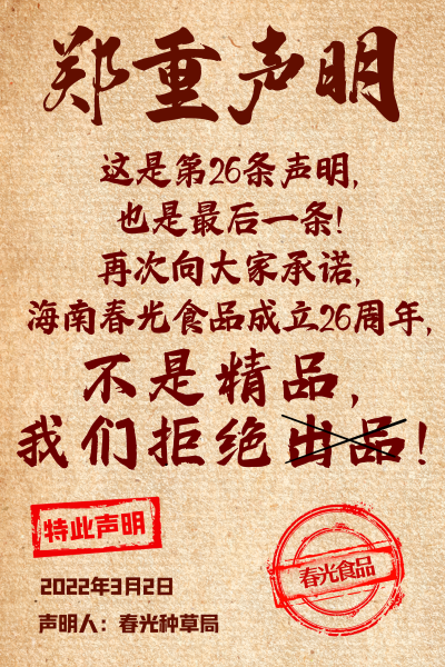 此外,春光食品在產(chǎn)品生產(chǎn)過程中推崇用好料、用足料、不忘初心、始終如一的研發(fā)和生產(chǎn)方針,產(chǎn)品拒絕添加香精、色素、防腐劑等,進一步滿足了消費者對于健康飲品和美味的需求。