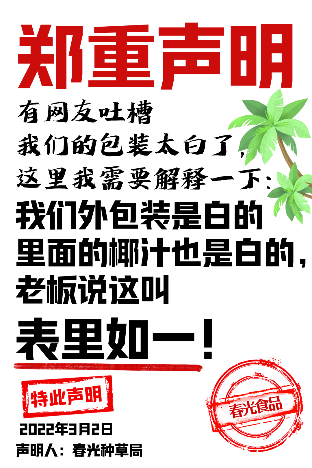 在這種背景下,市場需要一款注重產(chǎn)品品質(zhì),努力貼近年輕消費(fèi)群體的喜好,真正做到用“產(chǎn)品”說話的椰汁產(chǎn)品。春光食品作為海南老字號龍頭品牌,有著豐厚的椰子加工經(jīng)驗(yàn)以及椰子文化底蘊(yùn),面對新的行業(yè)風(fēng)口,選擇了用天然原料與先進(jìn)的“鎖鮮”工藝,以及低糖配方,推出“春光椰汁”新品,可謂精準(zhǔn)發(fā)力。